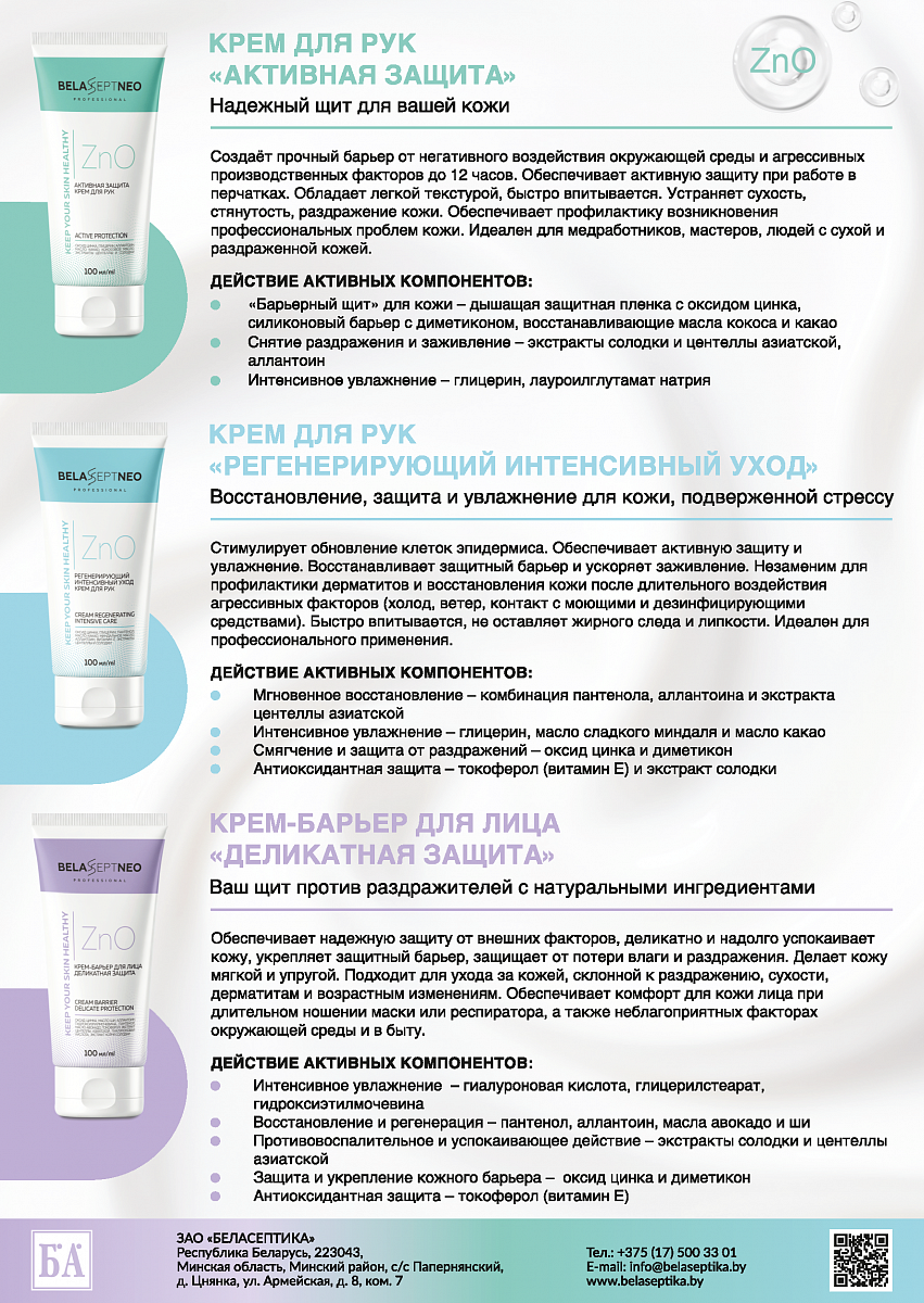 Продукция BELASEPTNEO professional разработана с учётом потребностей медицинских работников, специалистов пищевой и химической промышленности, сферы услуг, а также для всех, кто сталкивается с сухостью, раздражением или возрастными изменениями кожи. Все кремы прошли лабораторные исследования и клинические испытания.